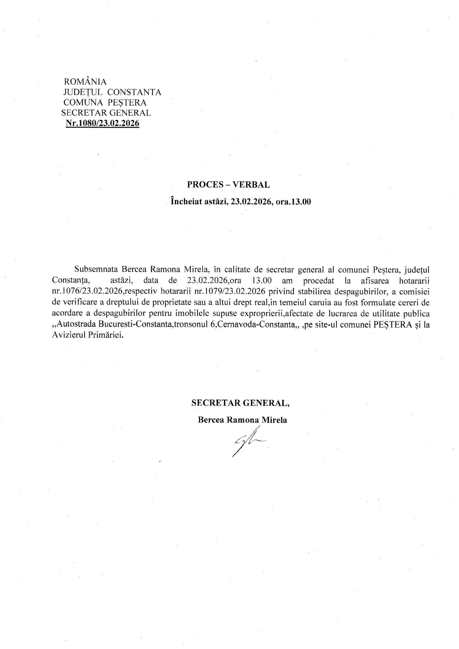Proces-Verbal privind afișarea hotărârilor de stabilire a despăgubirilor pentru exproprierea „Autostrada București-Constanța, Tronsonul 6, Cernavodă-Constanța” – Comuna Peștera
